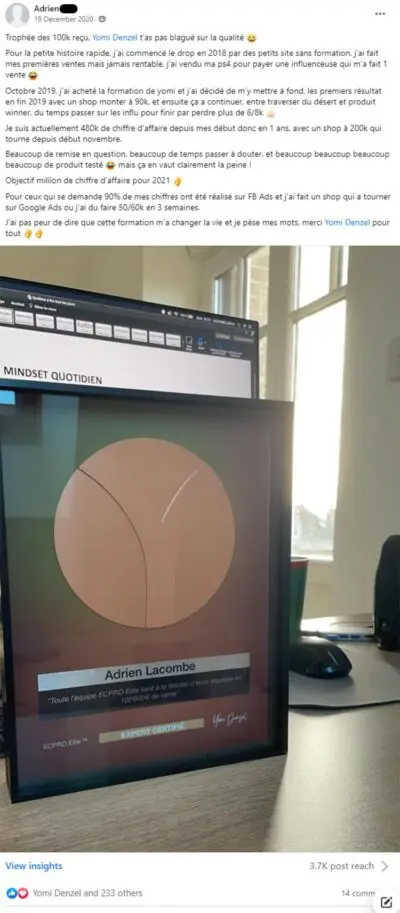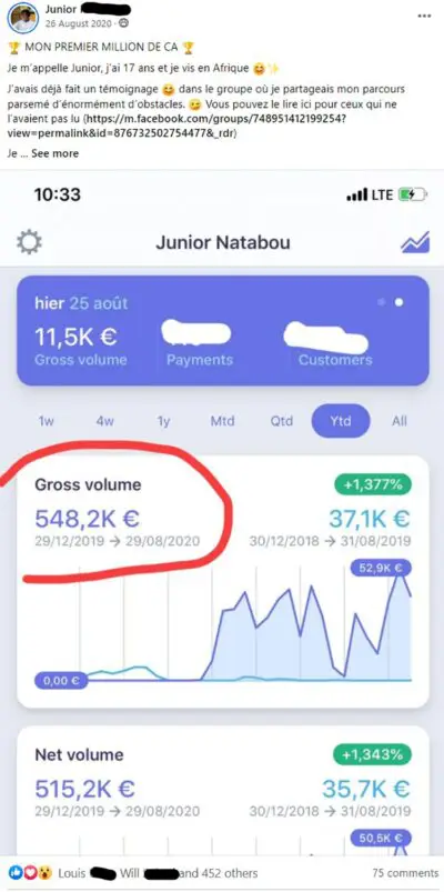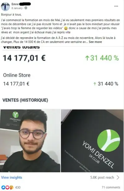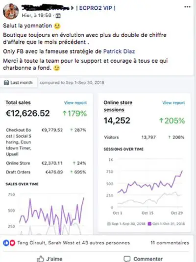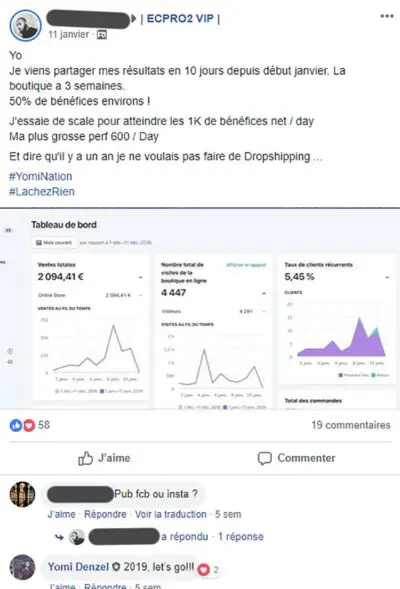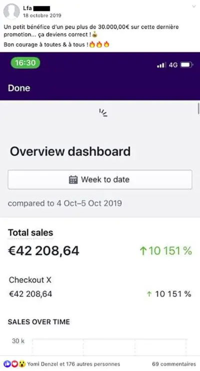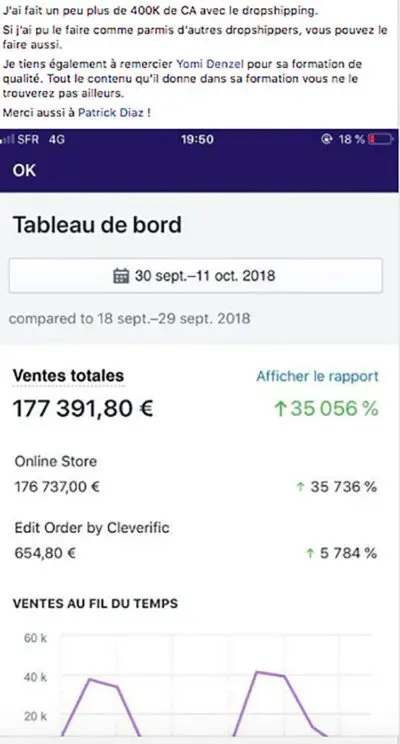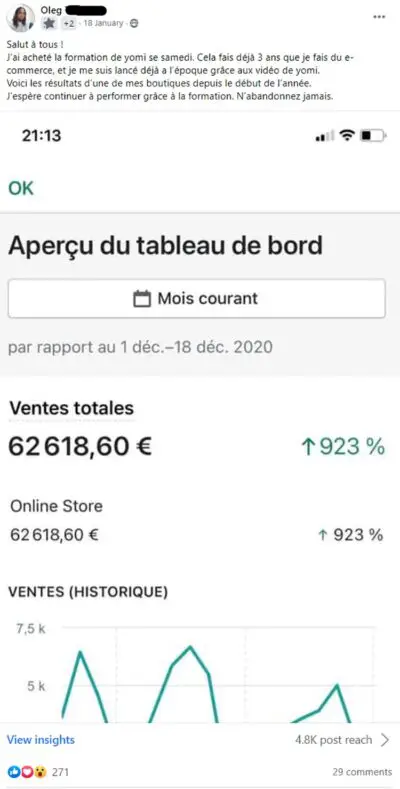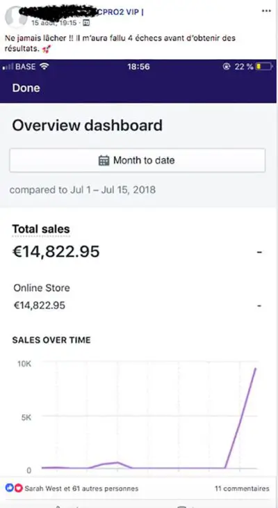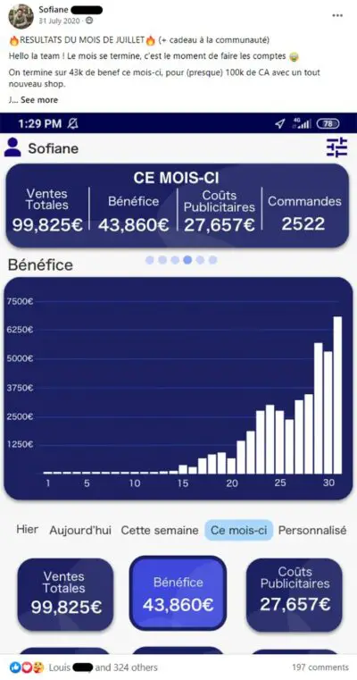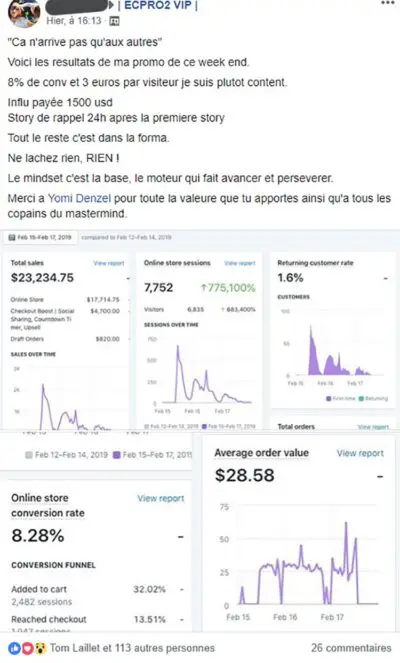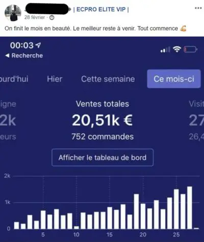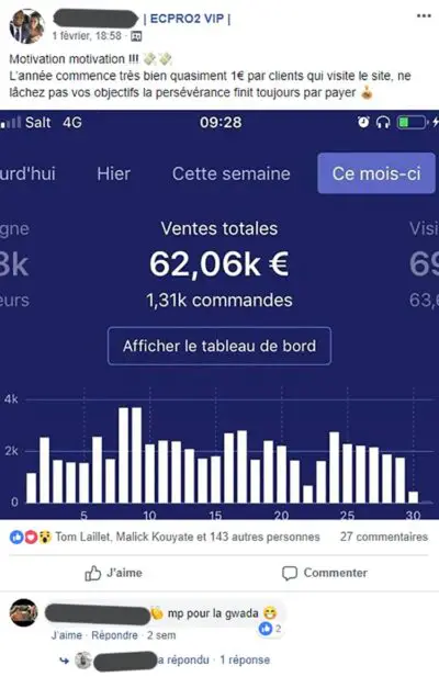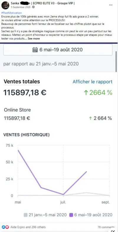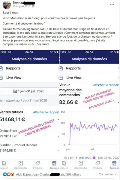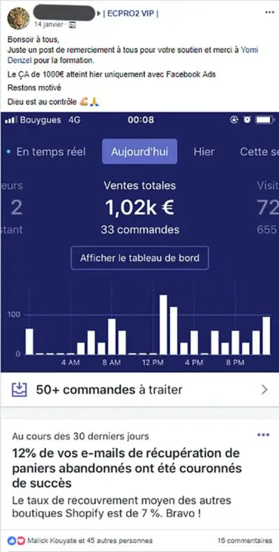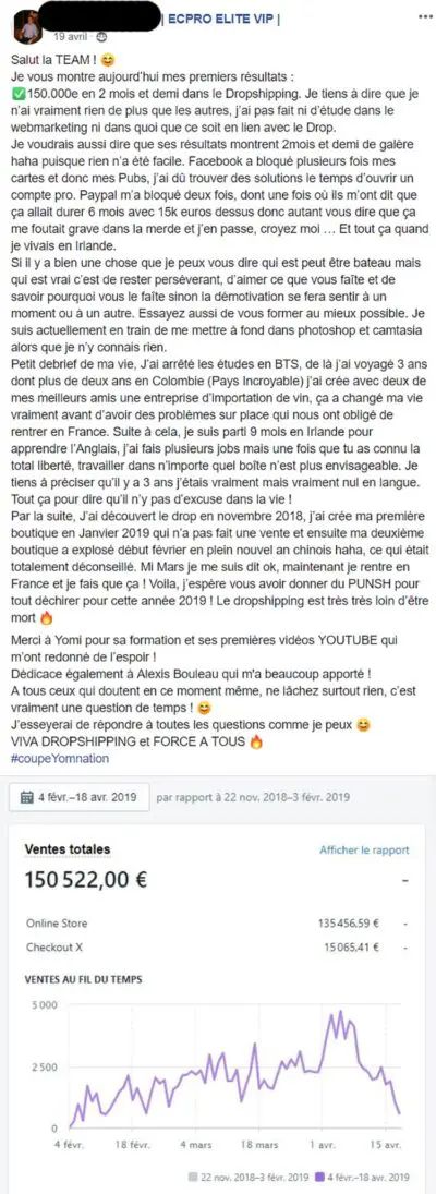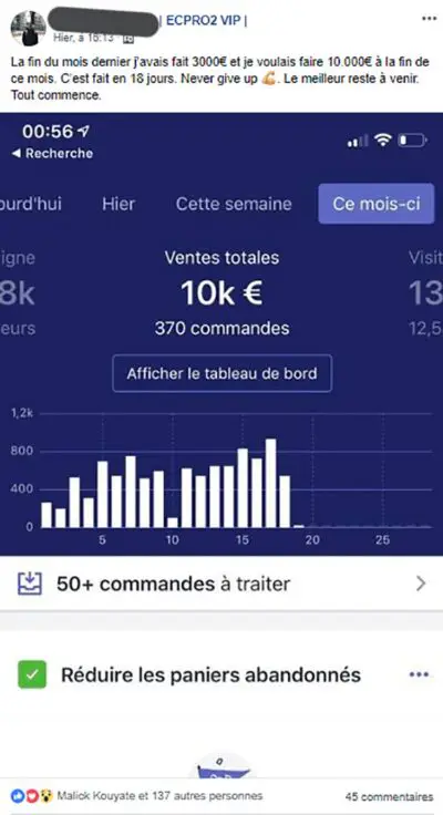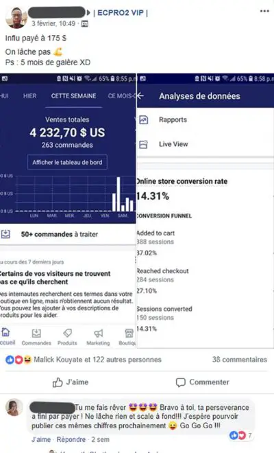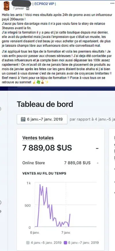 Les résultats ci-dessous sont le fruit d’un passage à l’action massif et de la mise en place assidue des stratégies expliquées dans la formation Ecom Pro. En effet, votre réussite dépend de votre investissement personnel, nous ne pouvons malheureusement pas travailler à votre place. Pour cette raison, nous tenons à préciser que nous ne garantissons aucun résultat.