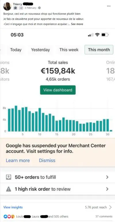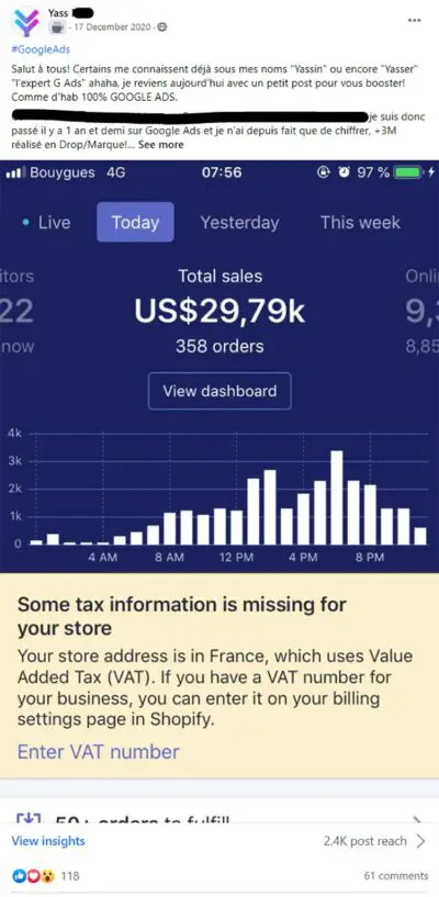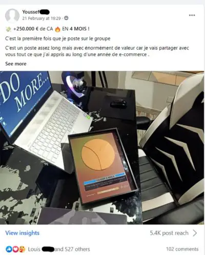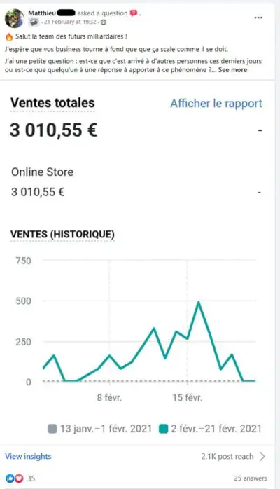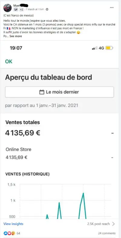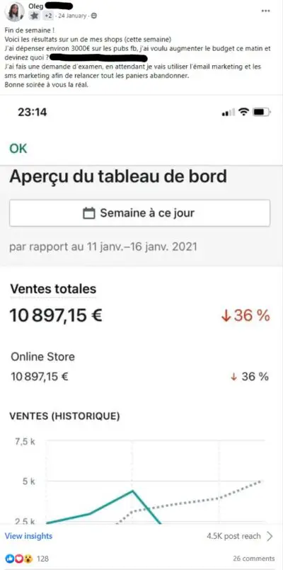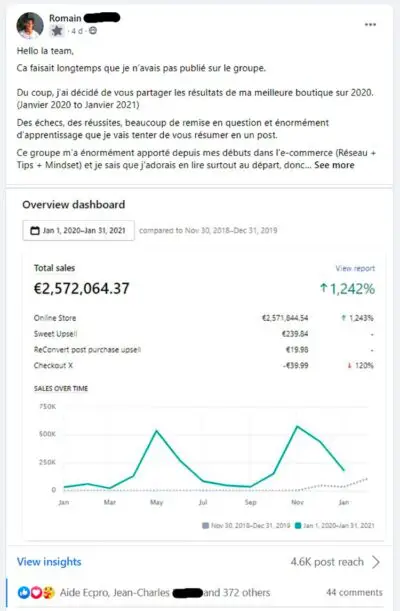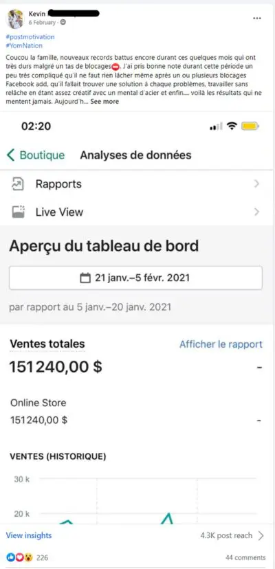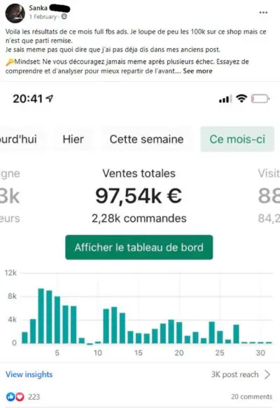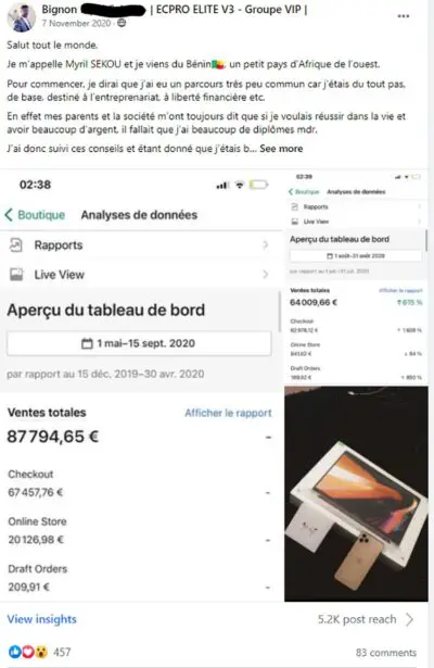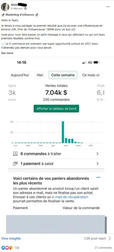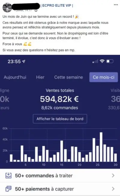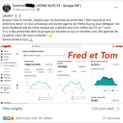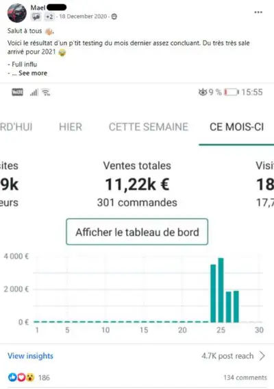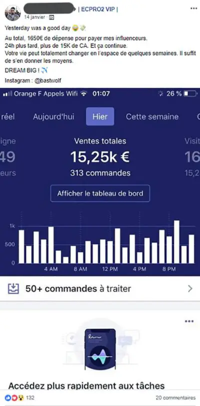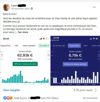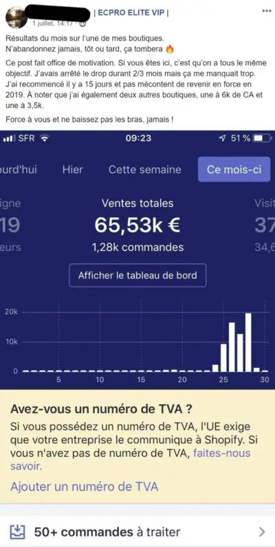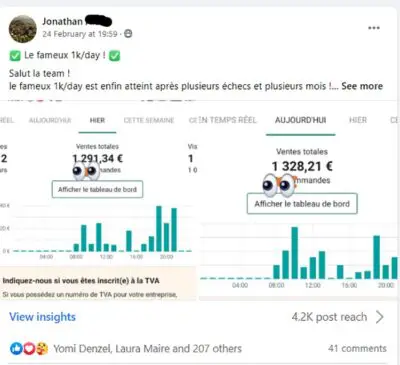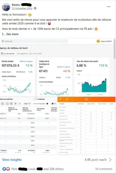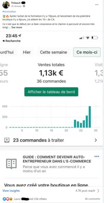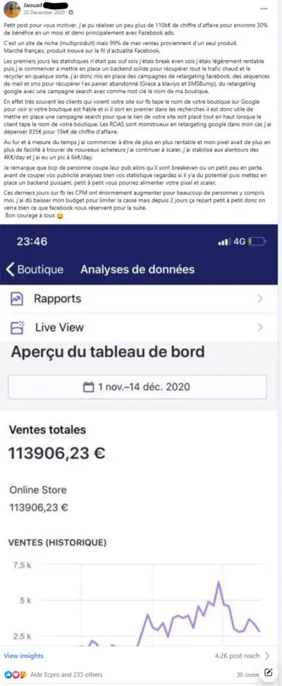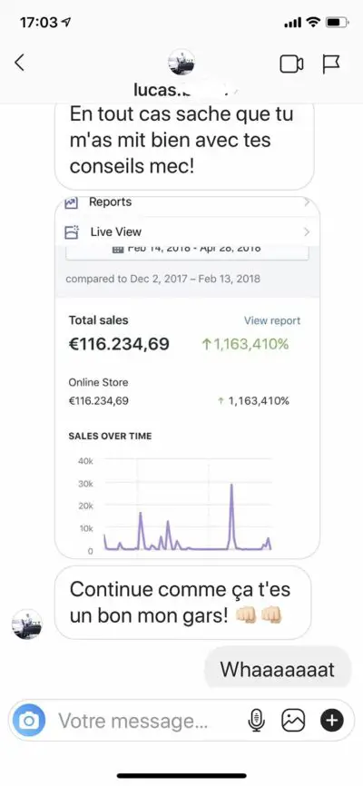 Les résultats ci-dessous sont le fruit d’un passage à l’action massif et de la mise en place assidue des stratégies expliquées dans la formation Ecom Pro. En effet, votre réussite dépend de votre investissement personnel, nous ne pouvons malheureusement pas travailler à votre place. Pour cette raison, nous tenons à préciser que nous ne garantissons aucun résultat.